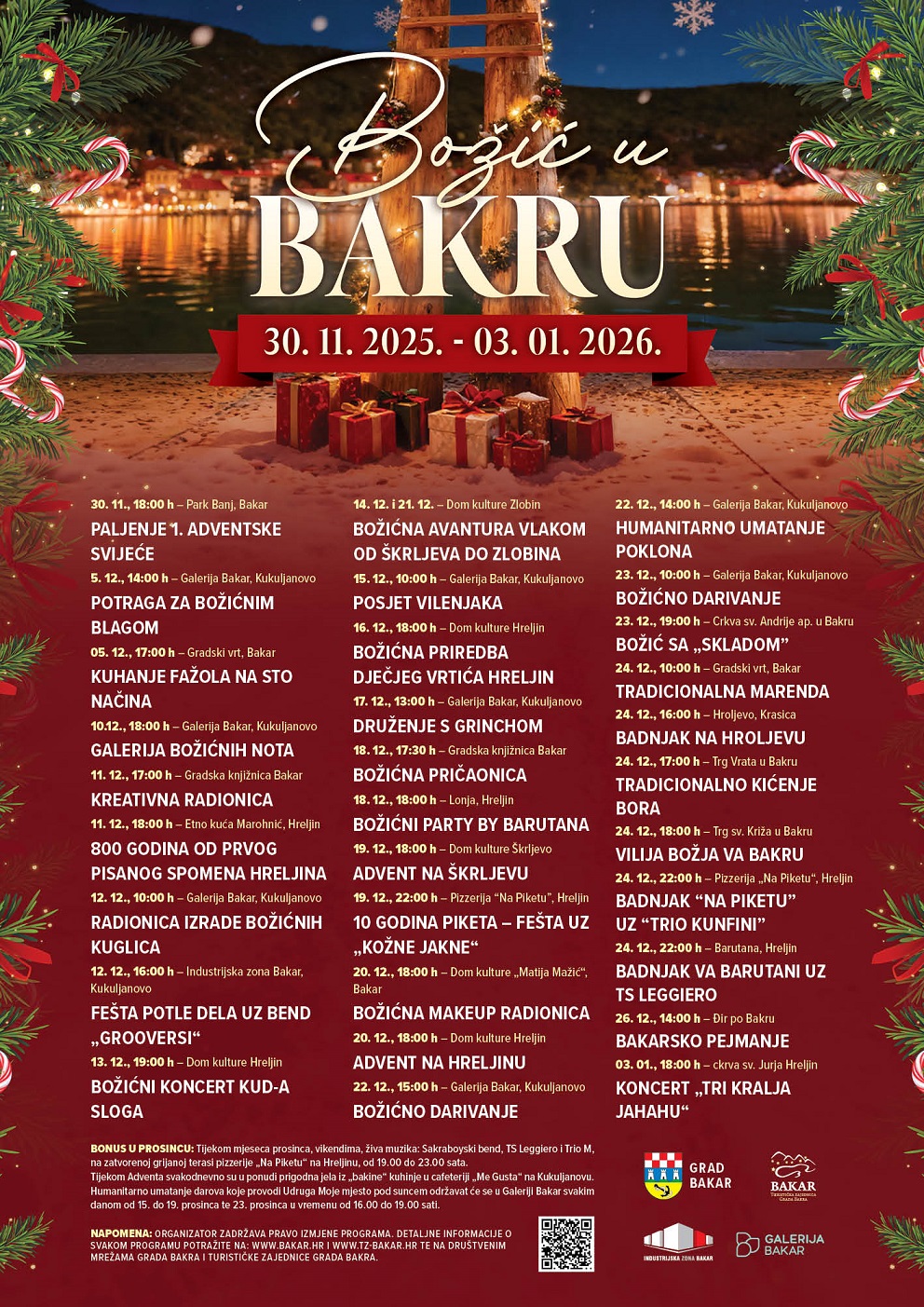 Božić u Bakru počinje 30. studenog paljenjem prve adventske svijeće u parku Banj uz bogat prigodni program s ciljem stvaranja toplog i tradicionalnog blagdanskog ozračja. Za velika i mala srca tu je mnoštvo događaja: od Potrage za božićnim blagom i podjele slatkih darova Svetog Nikole, preko kreativnih radionica poput izrade božićnih kuglica, Posebnu pažnju ove godine privlače Božićna avantura vlakom iz Škrljeva do Zlobina koja će se održati 14. i 21. prosinca, Fešta potle dela uz glazbeni nastup popularnog sastava “Grooverse“ 12. prosinca, te koncerti KUD-a Sloga i KUU-a Sklad 13. i 23. prosinca. Blagdanski duh osjetit ćete i u Industrijskoj zoni te Galeriji Bakar, gdje će se održavati tematski programi i izložbe. Na Badnjak u Gradskom vrtu održava se tradicionalna marenda i kićenje bora u centru Bakra, upriličeno uz pjevanje božićnih pjesama na Trgu sv. Križa. Djelatnici i volonteri uključuju se u bakarsko pejmanje, stari običaj zajedništva i pjesme po kućama. Božićni program završava 3. siječnja 2026. koncertom “Tri kralja jahahu” u crkvi Sv. Jurja na Hreljinu, uz nastupe ženskih i muških klapa koje dodatno podižu duh adventa u Bakru.