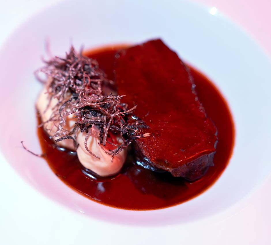 Slijedio je pomalo zaboravljeni pastrnjak, ovdje u karameliziranom obliku, pretvoren u kremasti pire s bijelom čokoladom. Poslužen je uz golubova prsa pečena na smeđem maslacu i dimljenoj višnji te sljubljen s Santa Luciom 2018. – kombinacija koja je iznenadila i najiskusnije goste.