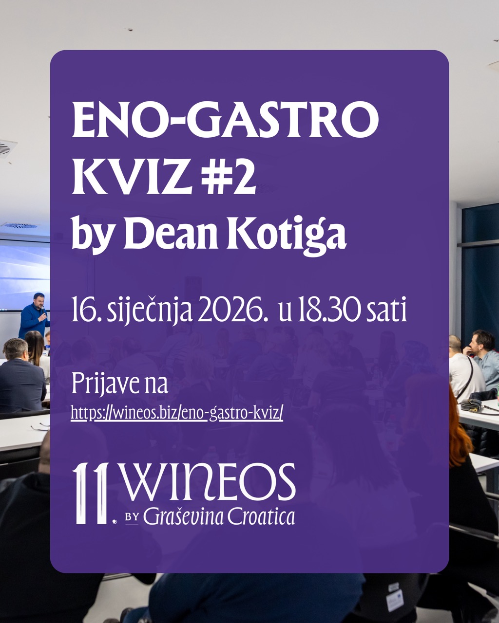 Eno-gastro kviz održat će se prvoga dana sajma, u petak, 16. siječnja 2026. u 18:30 sati, u Gospodarskom centru Osječko-baranjske županije. Zbog iznimnog interesa prošle godine, broj ekipa povećan je na 30, što je idealna prilika da okupite svoj tim i okušate se u kvizu gdje se znanje o vinu, gastronomiji i općoj kulturi isprepliće s brzim razmišljanjem i dobrom dozom humora.
