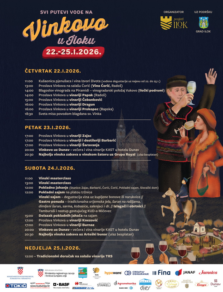 Vinkovo u Iloku, tradicionalna proslava svetog Vinka – zaštitnika vinogradara – održat će se od 22. do 25. siječnja 2026., okupljajući ljubitelje vina, vinogradare i poštovatelje srijemske tradicije u staroj jezgri grada i iločkim vinarijama. Manifestacija simbolično označava početak nove vinogradarske godine kroz blagoslov vinograda, rezidbu vinove loze radi predviđanja uroda te običaj vješanja kobasica na trsove kao znak želje za obiljem i rodnom godinom.