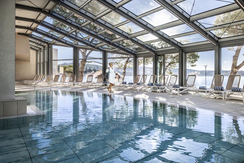 Jedna od najvećih prednosti ovog resorta je morski vodeni park Termaris. Riječ je o kompleksu bazena s grijanom morskom vodom, što znači da možete uživati u morskom iskustvu čak i kada temperature mora nisu za kupanje. Prostor je dizajniran tako da briše granicu između unutarnjeg i vanjskog a velike staklene stijene omogućuju pogled na otvoreno more dok se opuštate i plivate u toploj vodi. Ovo nije klasično kupanje, već doživljaj koji kombinira prirodu i komfor.