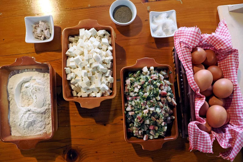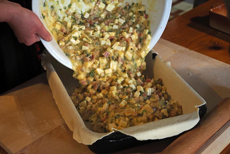U zdjelu u kojoj se miješaju jaja dodaju se kvas i sir narezan na male komadiće. Slanina i luk (također narezani na komadiće) poprže se na masti dok luk ne omekša. Kad se ohladi, doda se u jaja i sir, zatim sol, papar i brašno, pa se sve dobro promiješa. Smjesa treba biti gusta da lijepo pada sa žlice. Izlije se u protvan namazan mašću u koju ste stavili tijesto, rubovi se nakon dodavanja smjese preklope, te se sve peče na srednje jakoj vatri oko 45 minuta.