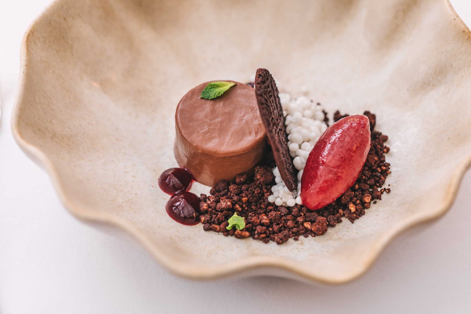 Ostavite mjesta za desert — vjerujte nam. Kombinacija tonke i vanilije s jagodama u bazgi i limeti donosi svježinu s aromatičnim notama, dok desert od breskve i bosiljka s jogurt namelakom igra na kartu balansa i laganih, čistih aroma. Za ljubitelje klasike u modernoj varijanti tu su biskvit od mrkve i naranče s kremom od rikote te čokoladni crémeux s mentom i višnjom — intenzivno, zaigrano — za pravi wow efekt na kraju.